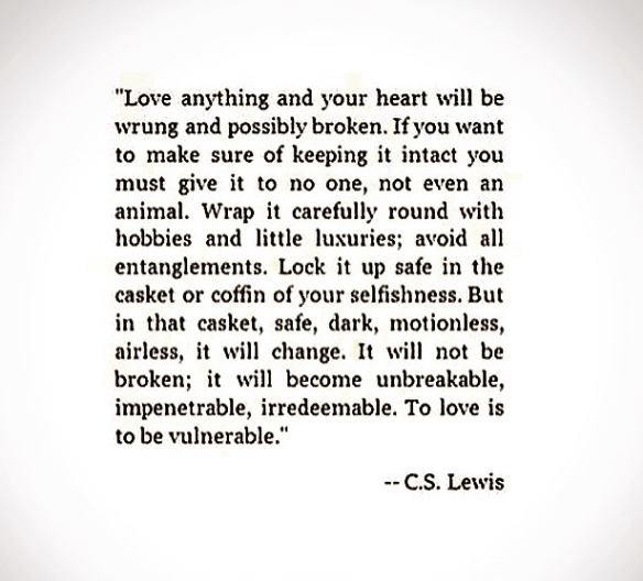 day 252 🌺 Posted on September 9, 2015 by overcastandhazy 3 Book quoting day seven — quite long, but says it all. 😁 “To love at all is to be vulnerable…” -C.S. Lewis, The Four Loves Happy Wednesday! 😘